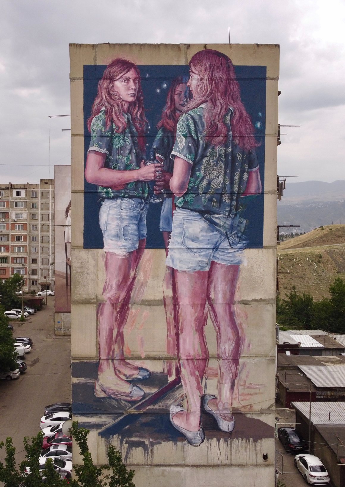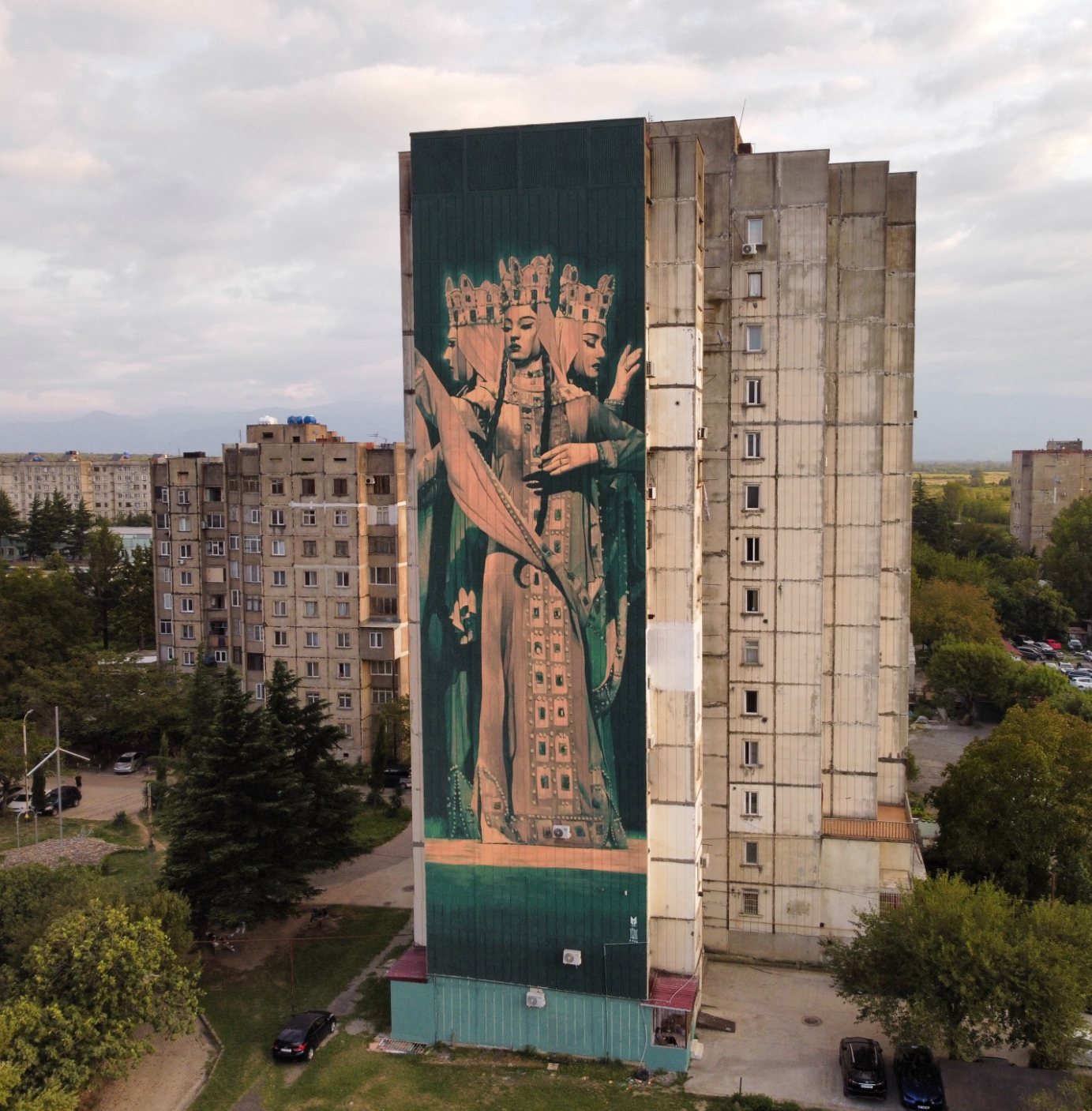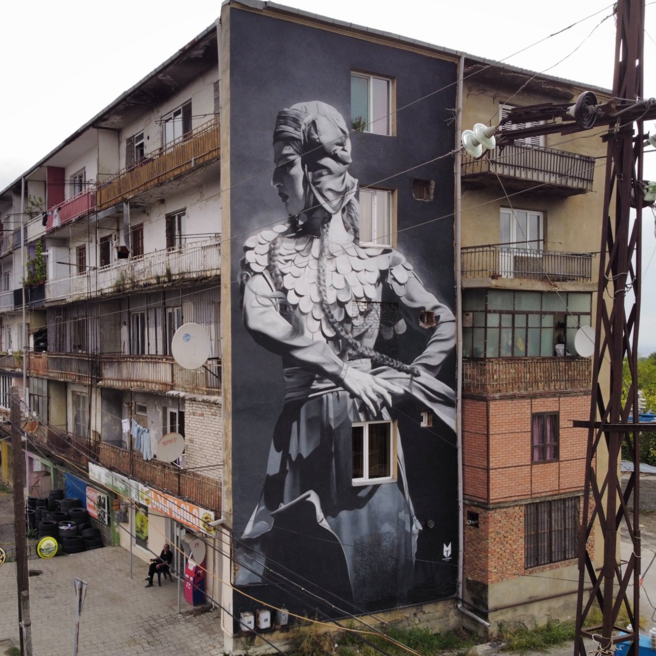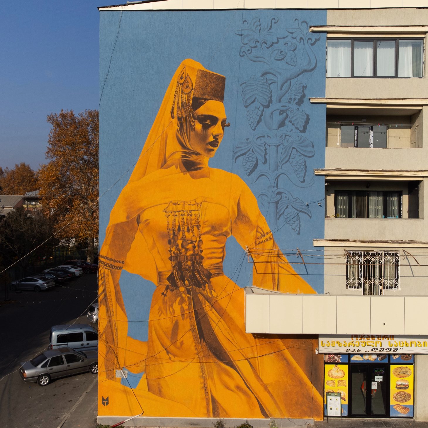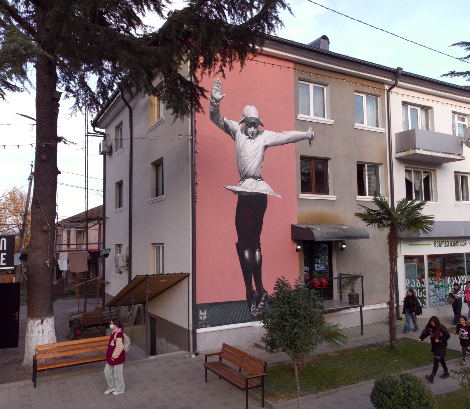 In Varketili, Dance by Afzan Pirzade with TMF Studio, brings movement into direct conversation with the city. Inspired by Georgian National Ballet dancers Natia Bakuradze and Lash Kuprashvili, the dance appears suspended between strength and release. The body holds intensity, yet the fabric and posture suggest motion still unfolding. Against the rigid geometry of the building, the mural introduces rhythm where none existed before, and is a beautiful addition to the community.