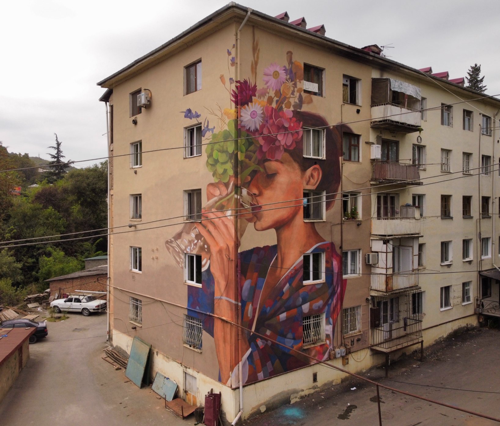 Nearby, Artez’s Thirst for Nature continues this reflection. A figure drinks from a vase overflowing with flowers, an act between nourishment and longing. Set within the everyday rhythm of Gurjaani, the mural reflects the deeper desire for reconnection with nature.