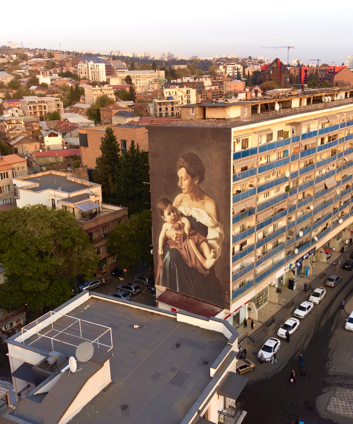 In Mother and Child, a collaboration between Afzan Pirzade and Besik Maziashvili, a classical composition unfolds quietly within the city. A mother cradles her child, rendered in muted tones that resist drama. Placed amid daily movement, the mural reflects how care and special bonds quietly persist across generations.